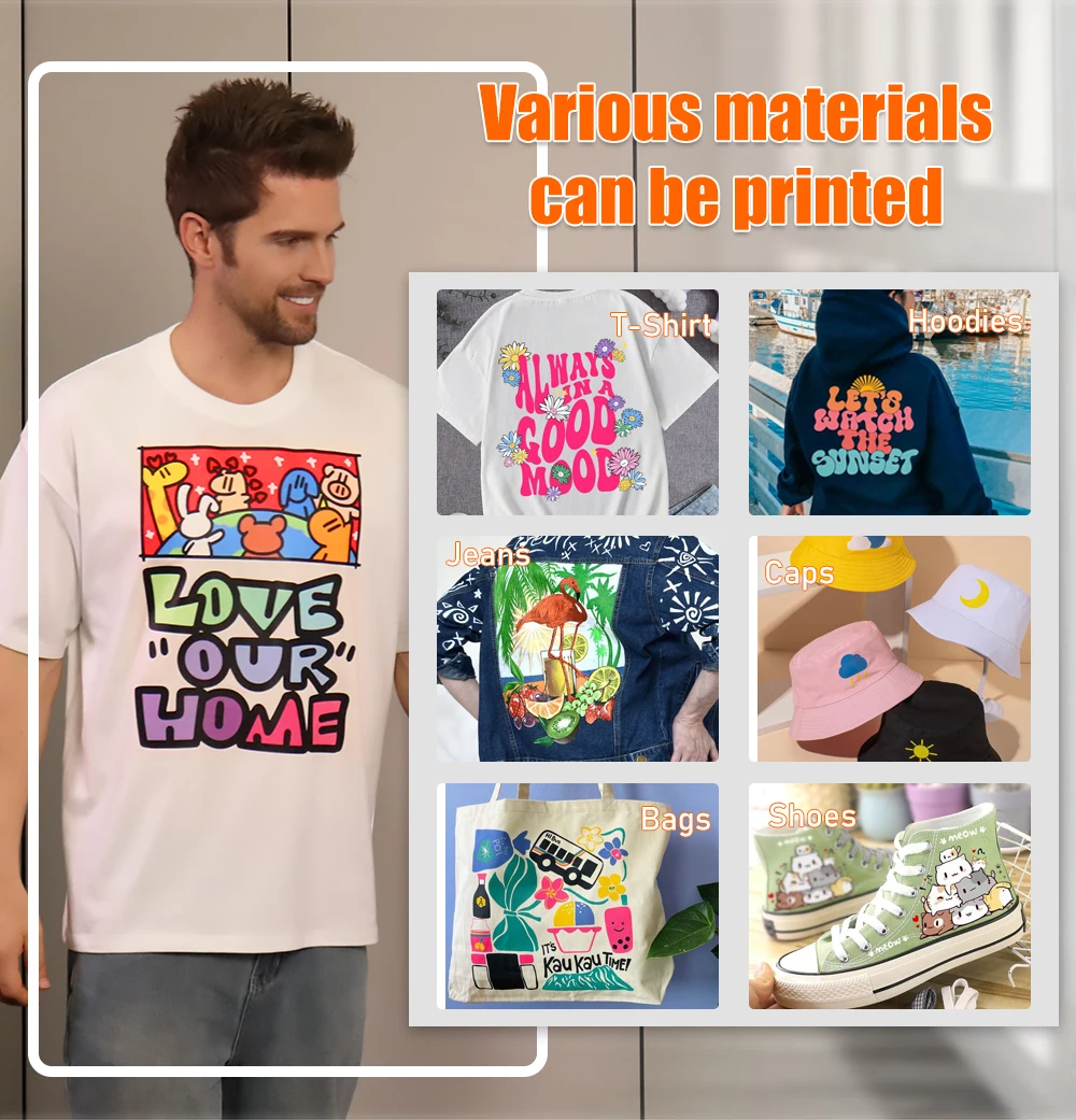 L’imprimante DTF suit un procédé “impression + transfert”. Le motif est d'abord imprimé sur un film PET spécial, puis une poudre thermofusible est appliquée automatiquement, secouée, puis fondue dans une chambre de séchage. Le motif est ensuite transféré sur le tissu à l’aide d’une presse à chaud.